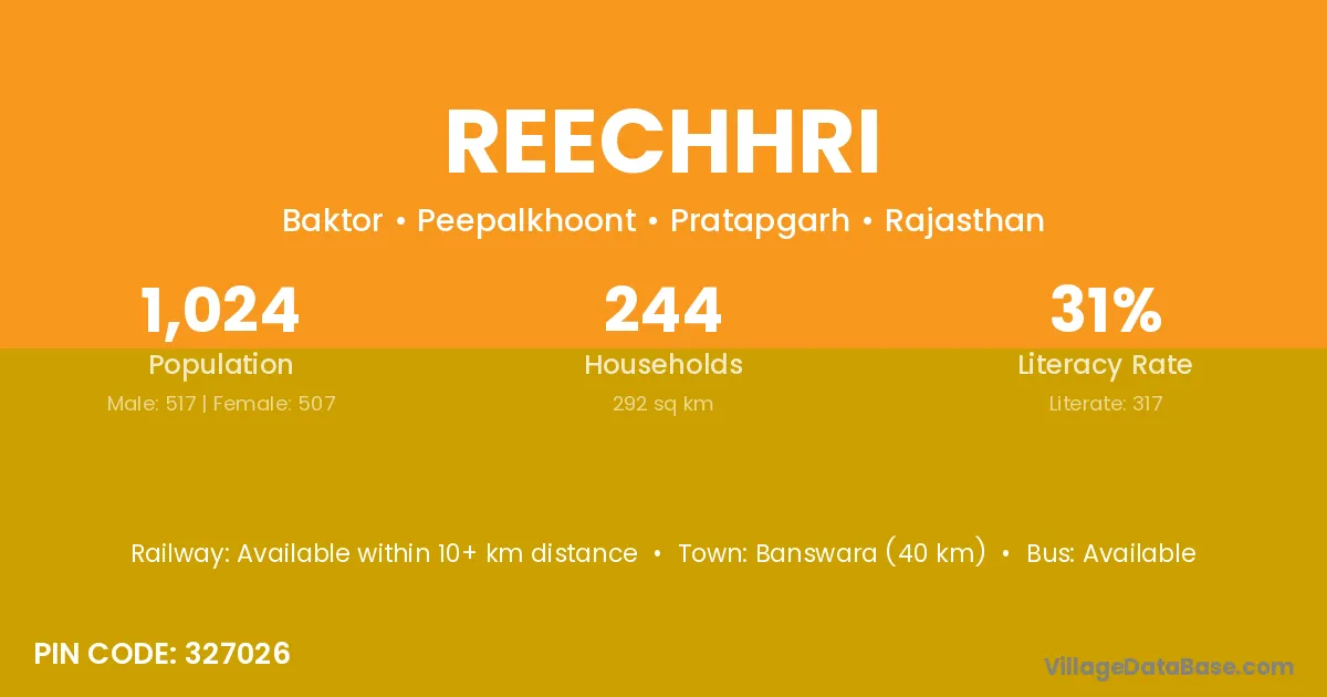 Pindwara (15 km) is the nearest town to Reechhri village for major economic activities and is located approximately 15 km away.