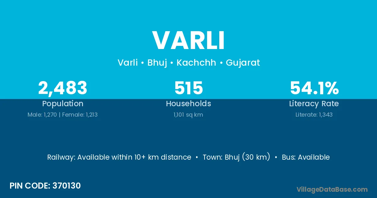 The literacy rate of Varli village is 21.99%. Male literacy stands at 30.99% and female literacy at 13.23%.