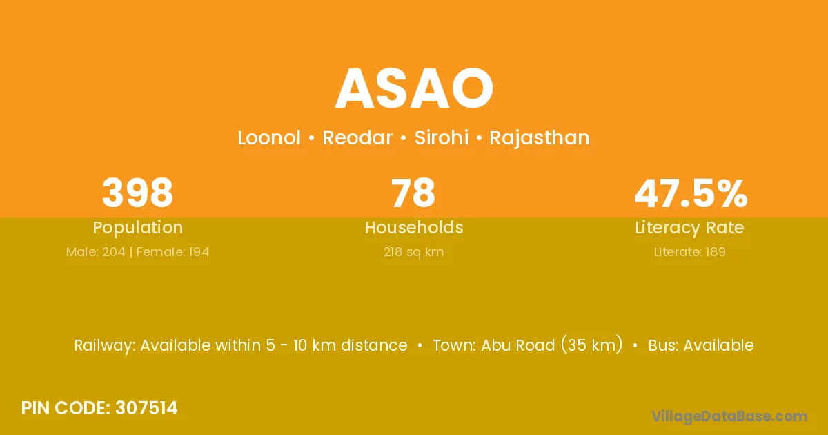 Abu Road (35 km) is the nearest town to Asao village for major economic activities and is located approximately 35 km away.
