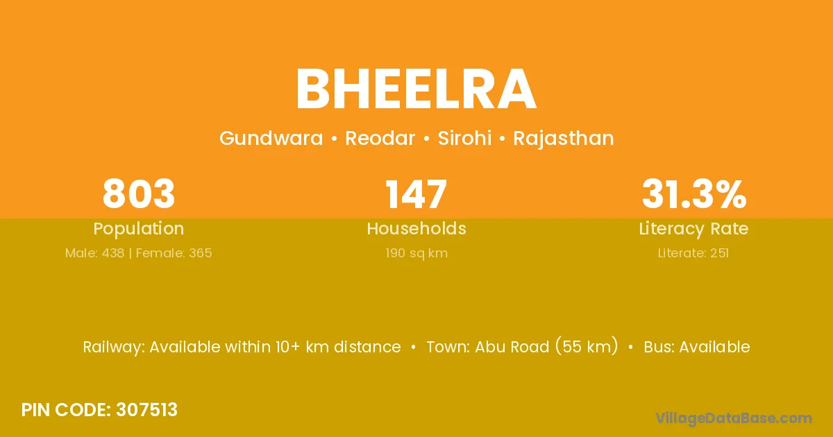 Abu Road (55 km) is the nearest town to Bheelra village for major economic activities and is located approximately 55 km away.
