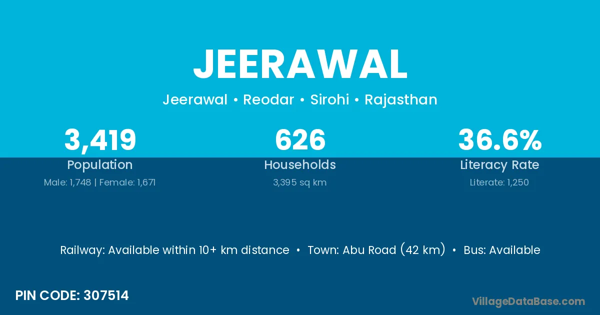 Abu Road (42 km) is the nearest town to Jeerawal village for major economic activities and is located approximately 42 km away.