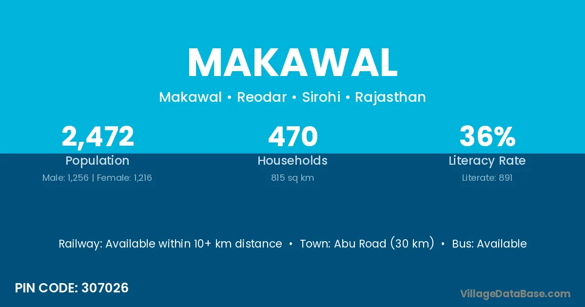 Abu Road (30 km) is the nearest town to Makawal village for major economic activities and is located approximately 30 km away.