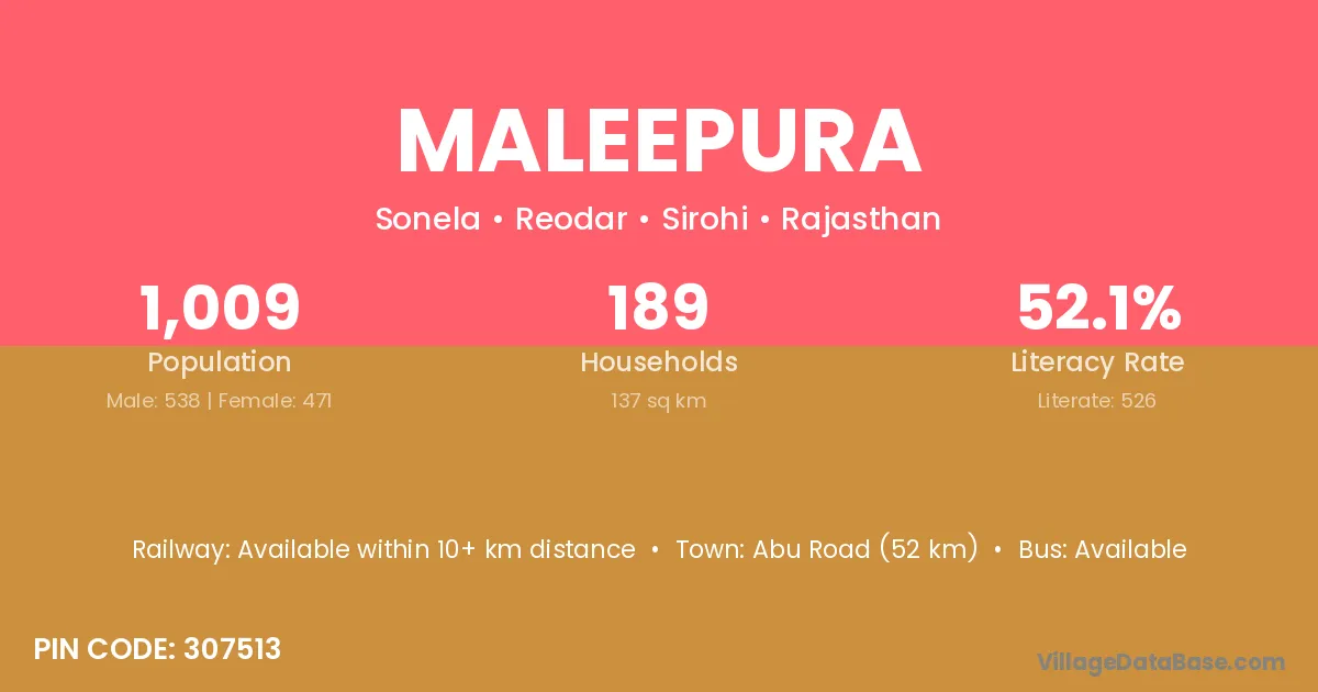 Abu Road (52 km) is the nearest town to Maleepura village for major economic activities and is located approximately 52 km away.