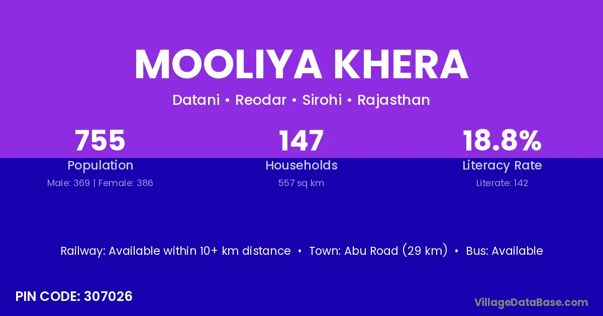 Abu Road (29 km) is the nearest town to Mooliya Khera village for major economic activities and is located approximately 29 km away.