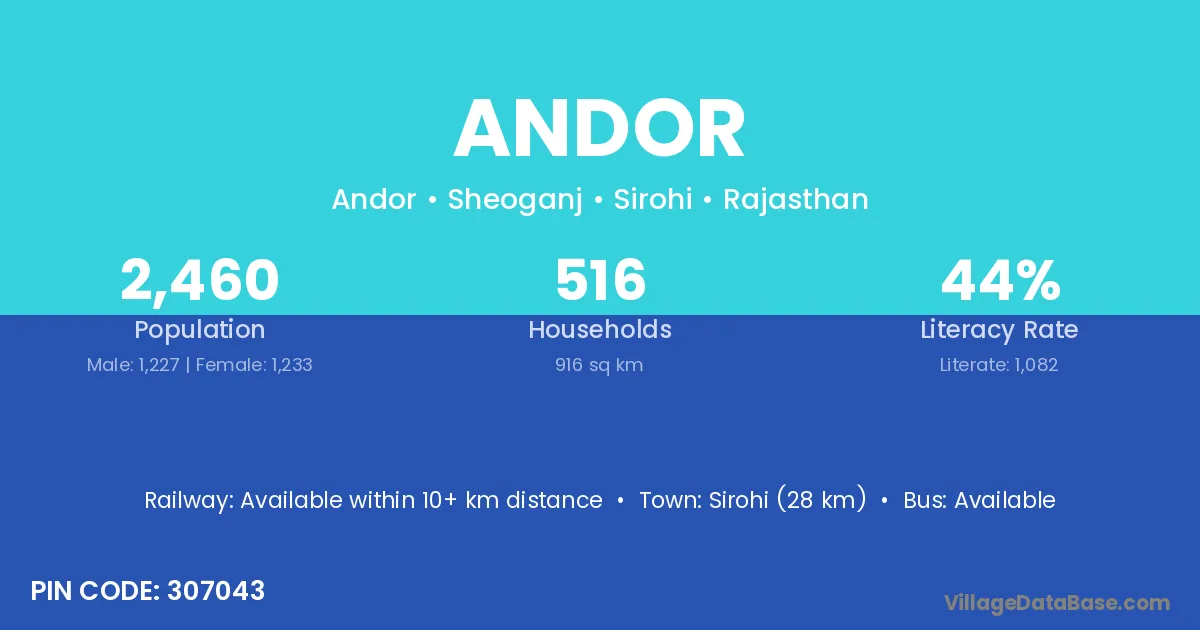 Sirohi (28 km) is the nearest town to Andor village for major economic activities and is located approximately 28 km away.