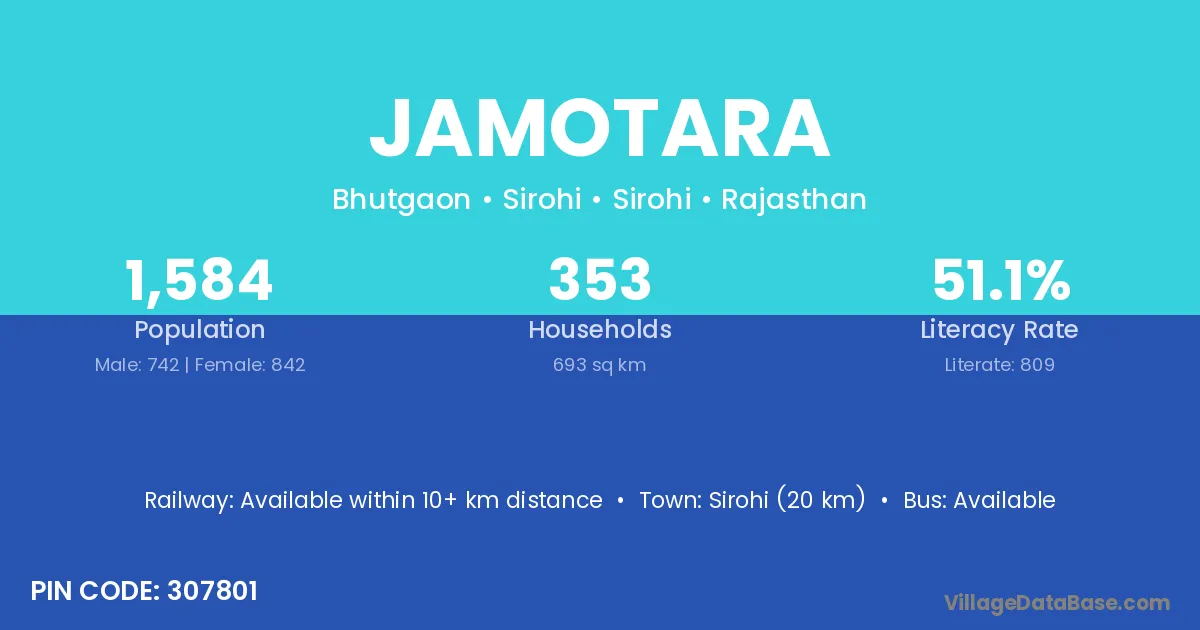 Sirohi (20 km) is the nearest town to Jamotara village for major economic activities and is located approximately 20 km away.