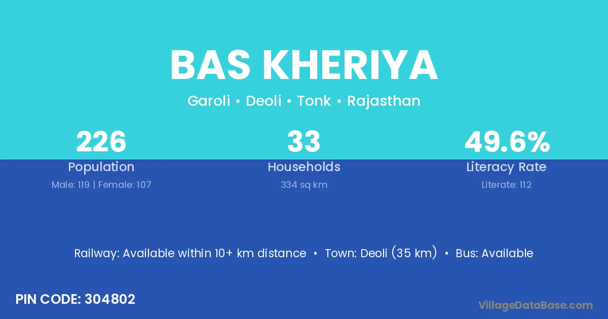 Deoli (35 km) is the nearest town to Bas Kheriya village for major economic activities and is located approximately 35 km away.