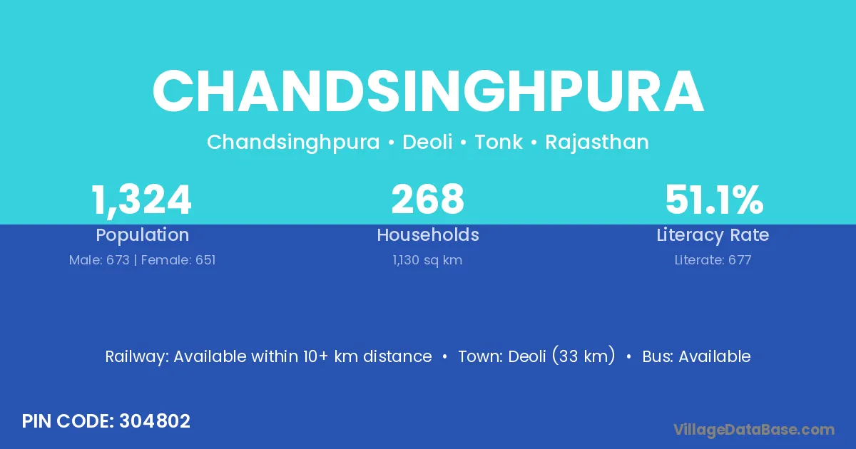 Deoli (33 km) is the nearest town to Chandsinghpura village for major economic activities and is located approximately 33 km away.