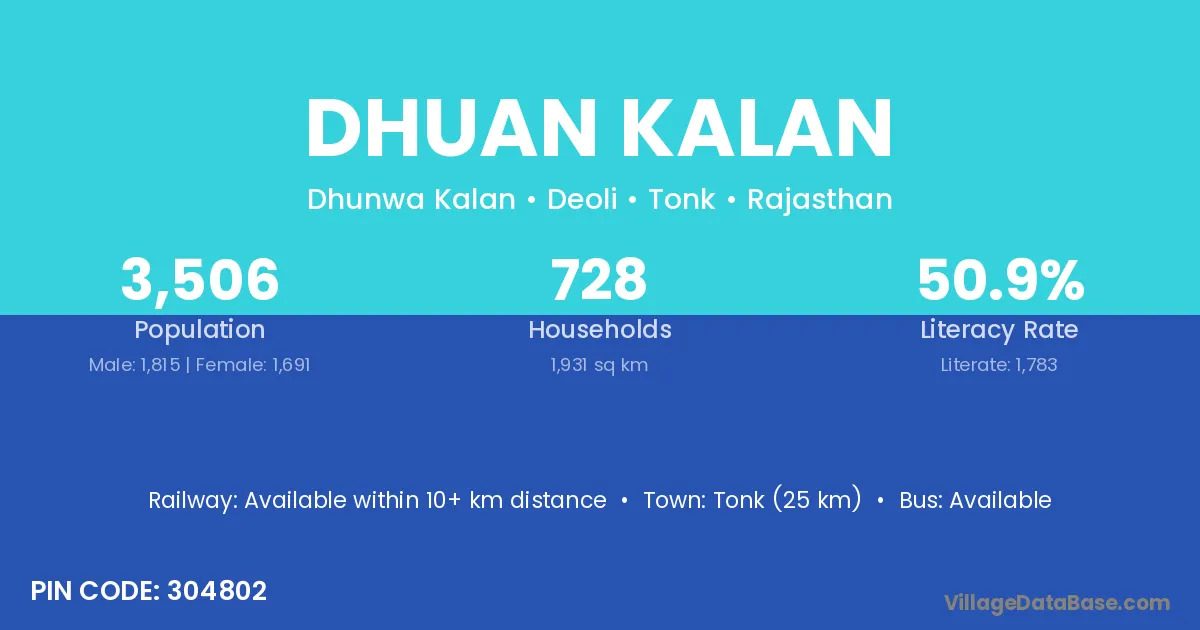 Tonk (25 km) is the nearest town to Dhuan Kalan village for major economic activities and is located approximately 25 km away.