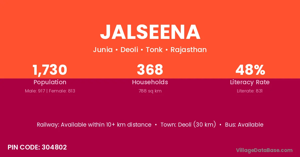 Deoli (30 km) is the nearest town to Jalseena village for major economic activities and is located approximately 30 km away.