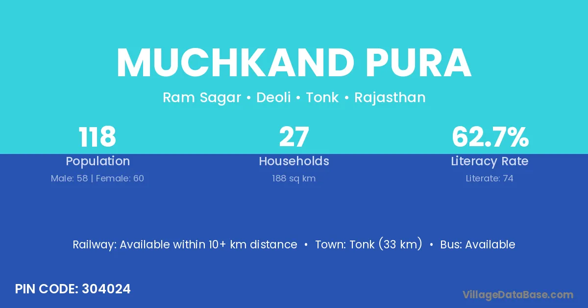 Tonk (33 km) is the nearest town to Muchkand Pura village for major economic activities and is located approximately 33 km away.