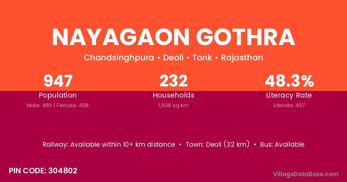 Nayagaon Gothra village has a total population of 947 people, of which 489 are males and 458 are females.