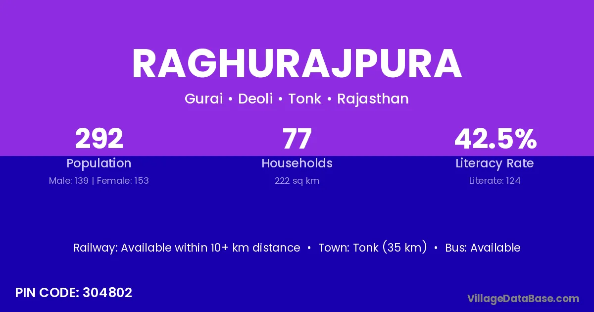 Tonk (35 km) is the nearest town to Raghurajpura village for major economic activities and is located approximately 35 km away.