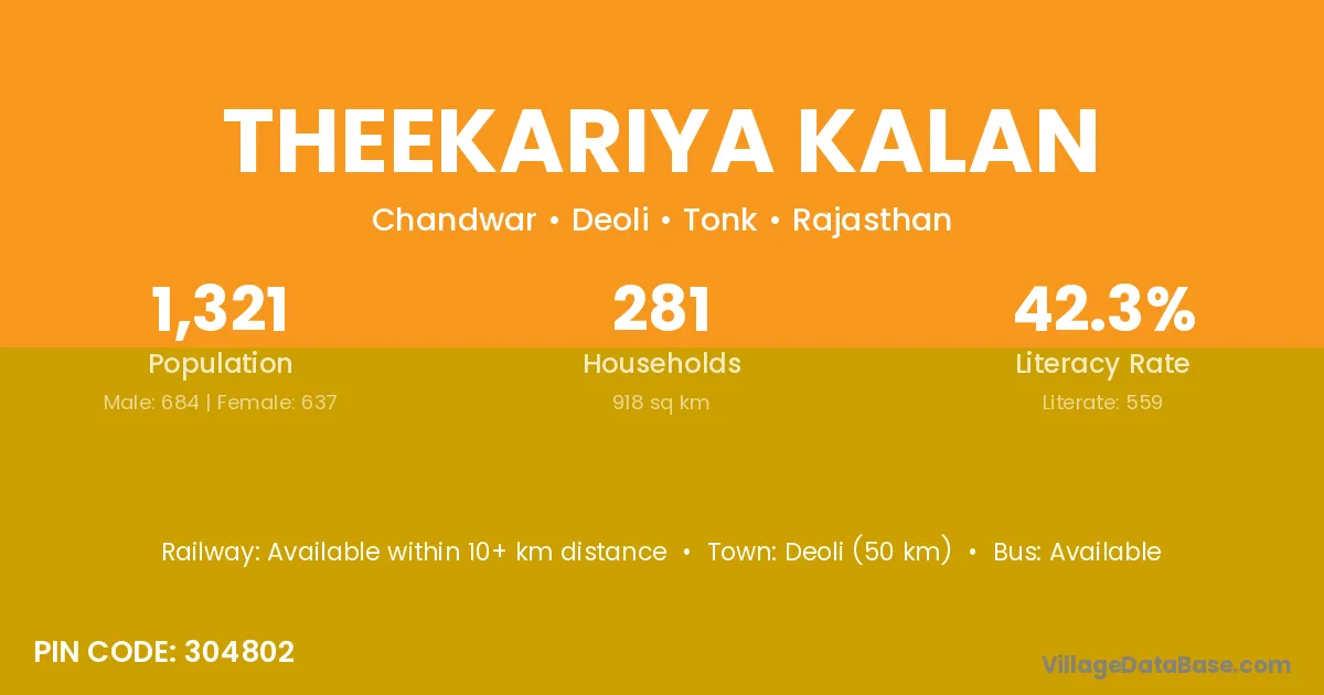 Deoli (50 km) is the nearest town to Theekariya Kalan village for major economic activities and is located approximately 50 km away.