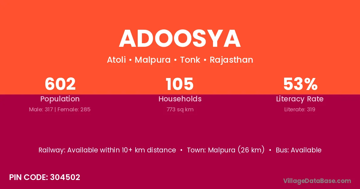 Malpura (26 km) is the nearest town to Adoosya village for major economic activities and is located approximately 26 km away.