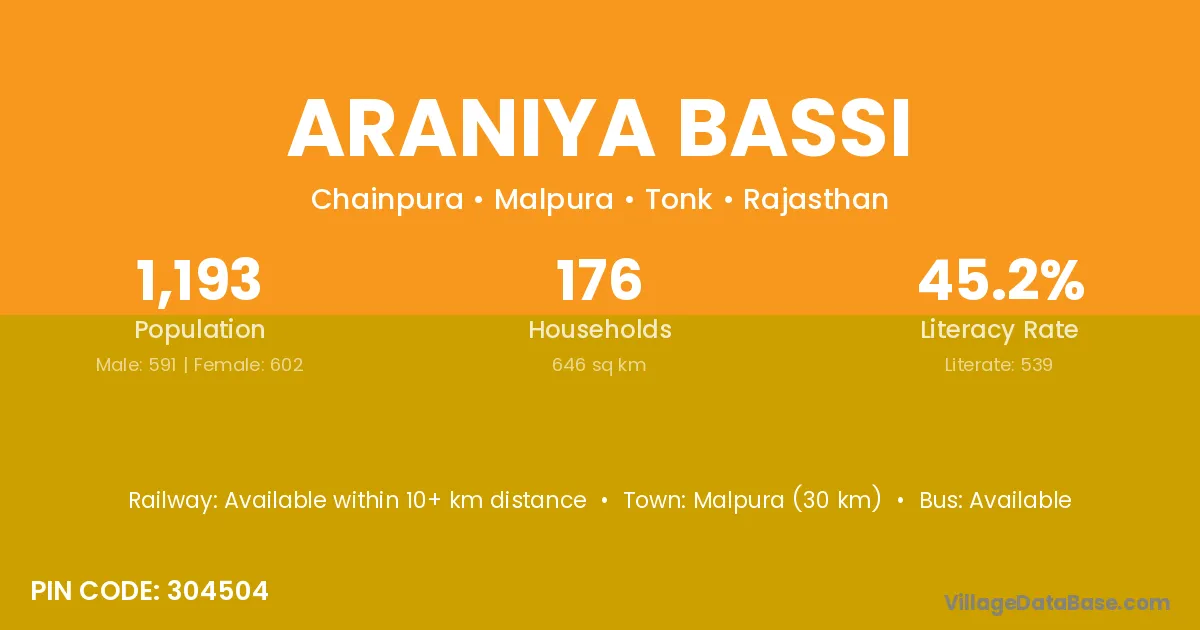 Malpura (30 km) is the nearest town to Araniya Bassi village for major economic activities and is located approximately 30 km away.
