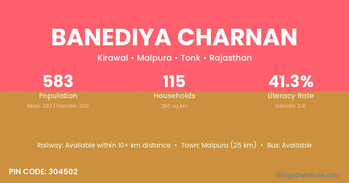 Malpura (25 km) is the nearest town to Banediya Charnan village for major economic activities and is located approximately 25 km away.