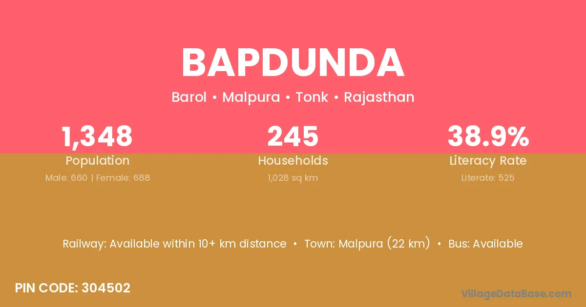Malpura (22 km) is the nearest town to Bapdunda village for major economic activities and is located approximately 22 km away.