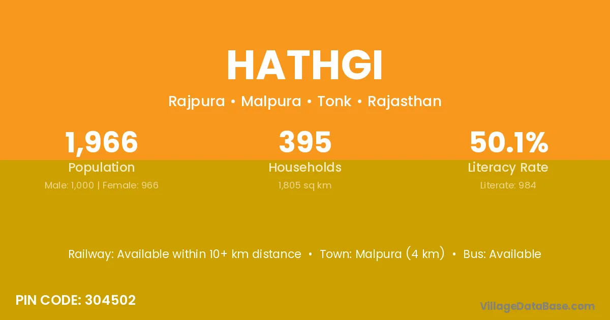 Malpura (4 km) is the nearest town to Hathgi village for major economic activities and is located approximately 4 km away.