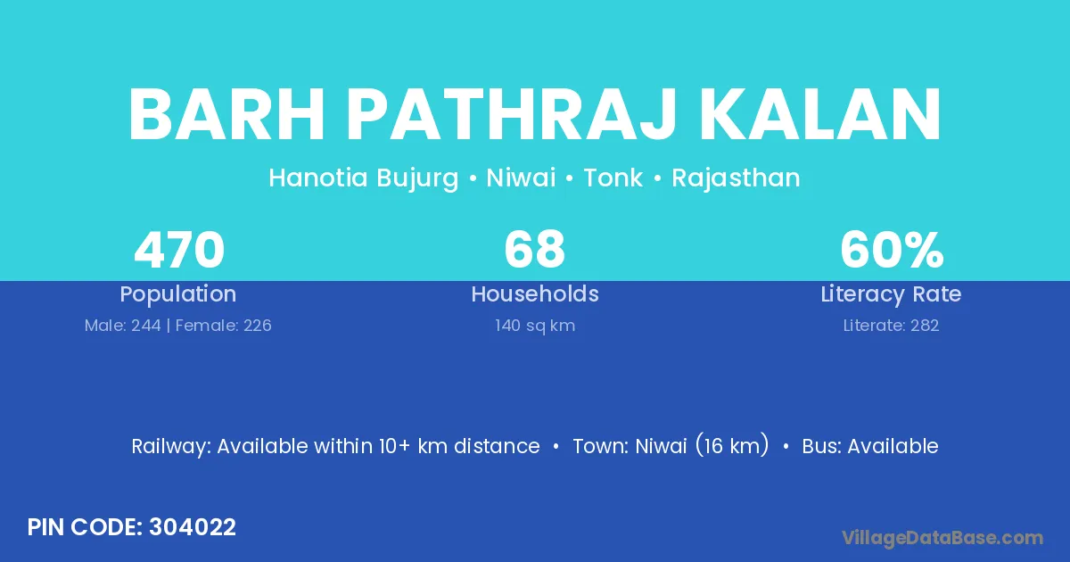 Niwai (16 km) is the nearest town to Barh Pathraj Kalan village for major economic activities and is located approximately 16 km away.
