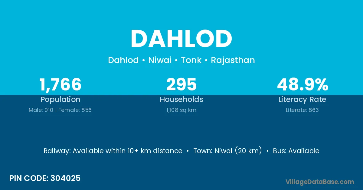 Niwai (20 km) is the nearest town to Dahlod village for major economic activities and is located approximately 20 km away.