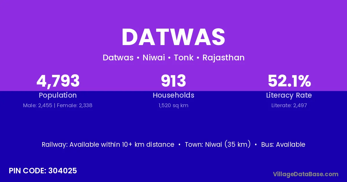 Niwai (35 km) is the nearest town to Datwas village for major economic activities and is located approximately 35 km away.