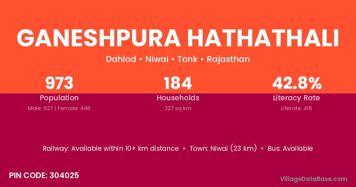 Niwai (23 km) is the nearest town to Ganeshpura Hathathali village for major economic activities and is located approximately 23 km away.