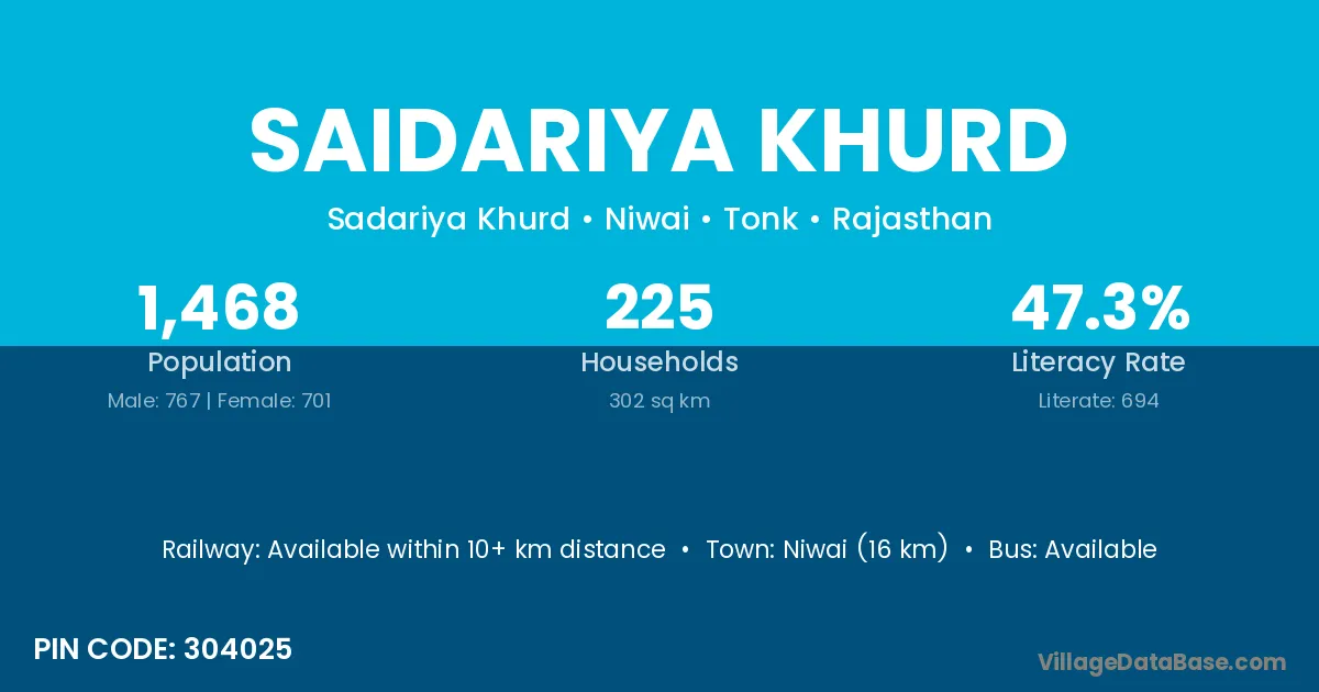 Niwai (16 km) is the nearest town to Saidariya Khurd village for major economic activities and is located approximately 16 km away.