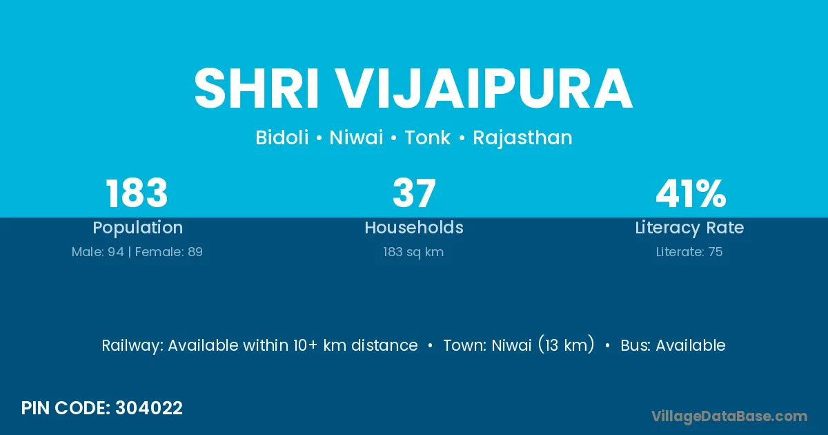 Shri Vijaipura village has a total population of 183 people, of which 94 are males and 89 are females.