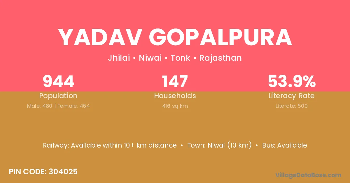 Yadav Gopalpura village has a total population of 944 people, of which 480 are males and 464 are females.