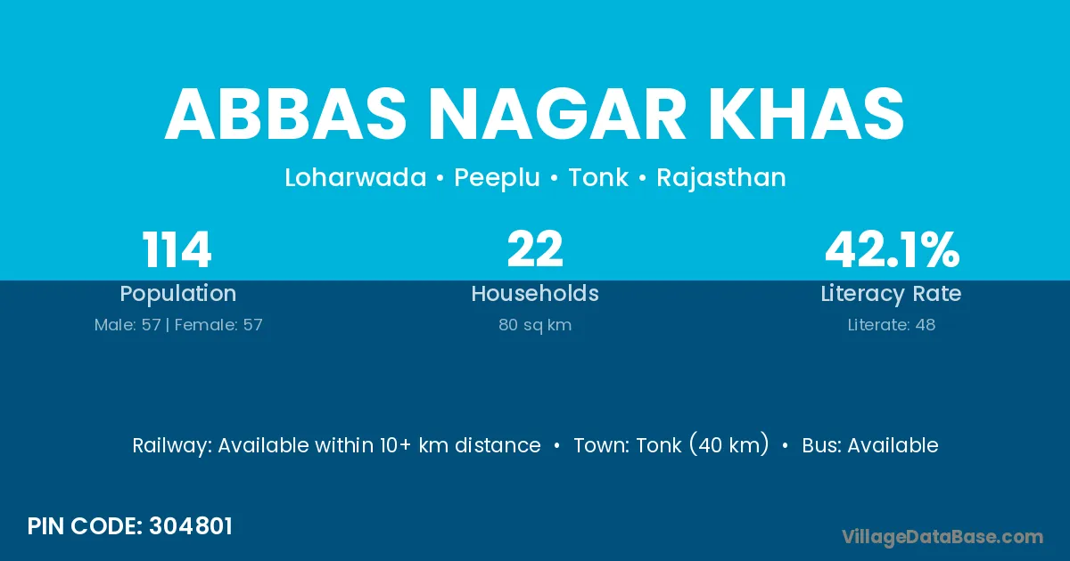 Tonk (40 km) is the nearest town to Abbas Nagar Khas village for major economic activities and is located approximately 40 km away.