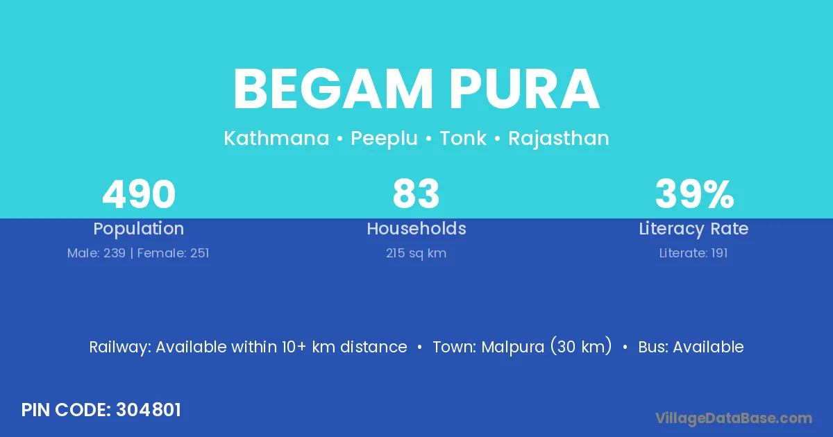 Malpura (30 km) is the nearest town to Begam Pura village for major economic activities and is located approximately 30 km away.