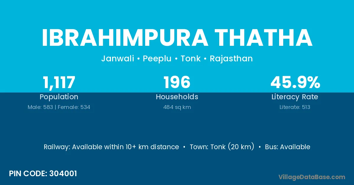 Tonk (20 km) is the nearest town to Ibrahimpura Thatha village for major economic activities and is located approximately 20 km away.