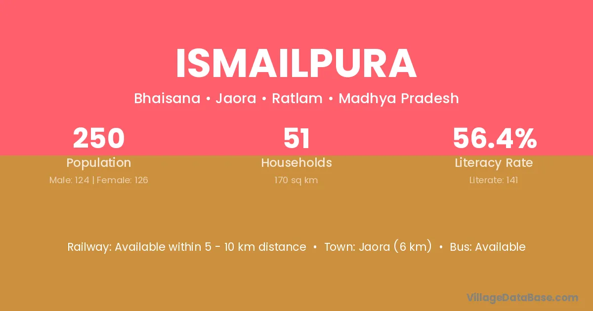 Ismailpura village has a total population of 369 people, of which 185 are males and 184 are females.