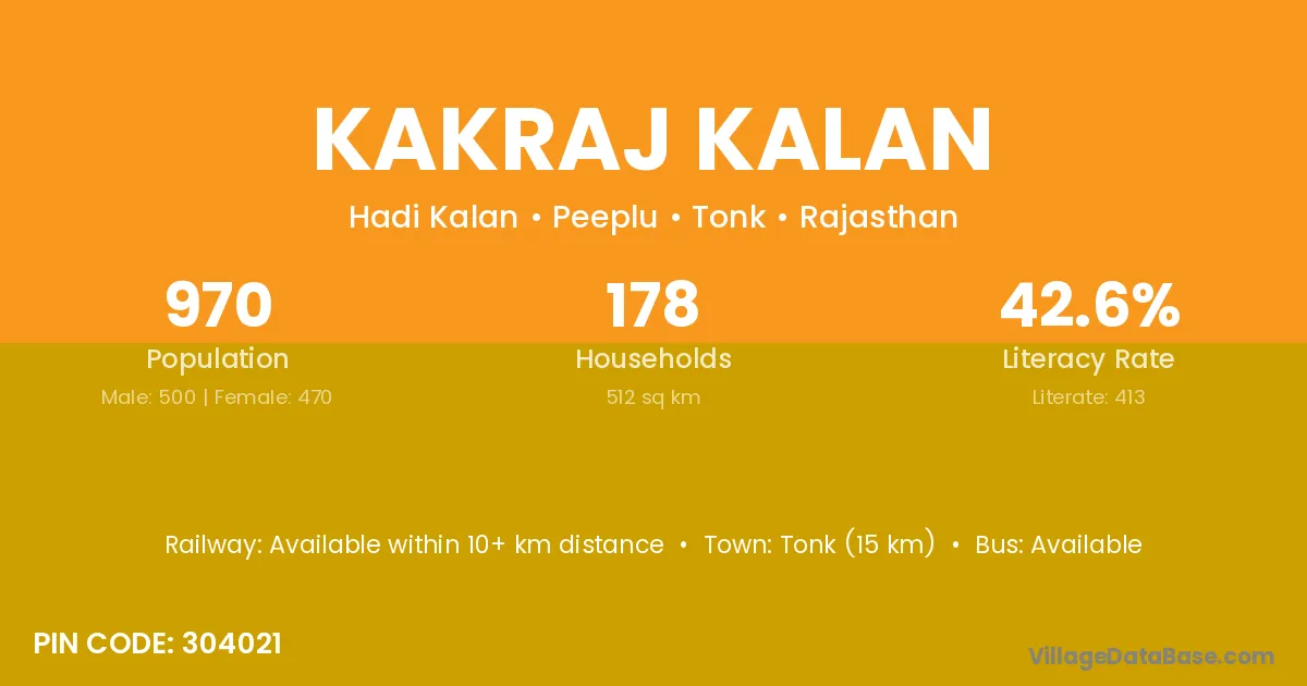 Tonk (15 km) is the nearest town to Kakraj Kalan village for major economic activities and is located approximately 15 km away.