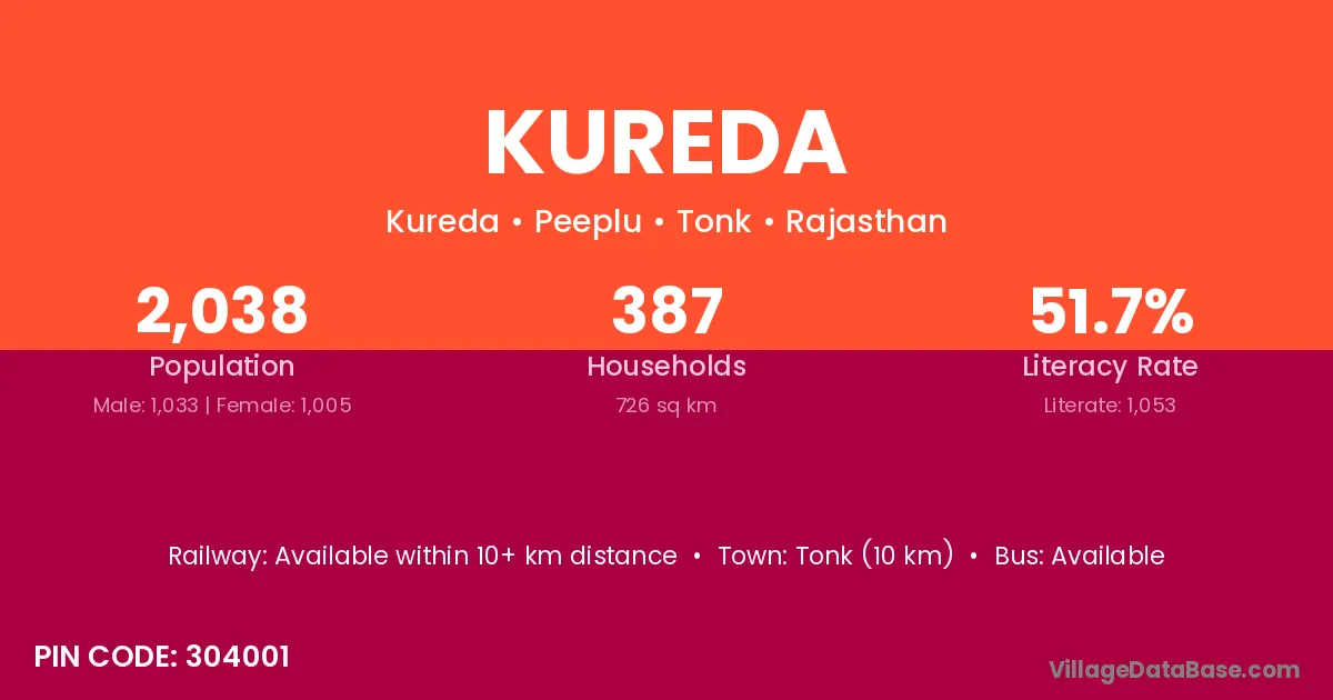 Tonk (10 km) is the nearest town to Kureda village for major economic activities and is located approximately 10 km away.