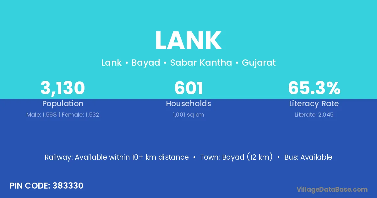 The literacy rate of Lank village is 51.60%. Male literacy stands at 67.86% and female literacy at 34.85%.