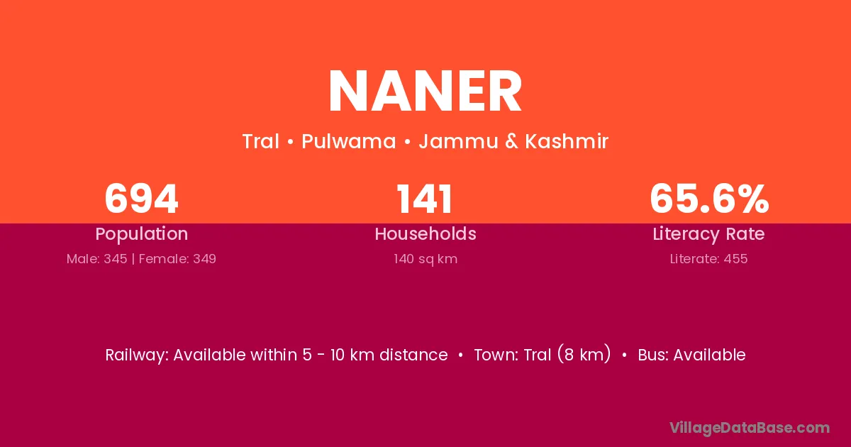 The literacy rate of Naner village is 47.33%. Male literacy stands at 58.98% and female literacy at 34.64%.