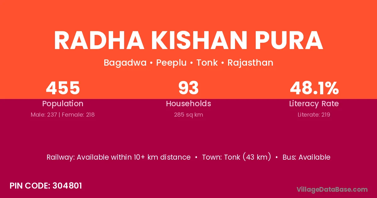 Tonk (43 km) is the nearest town to Radha Kishan Pura village for major economic activities and is located approximately 43 km away.