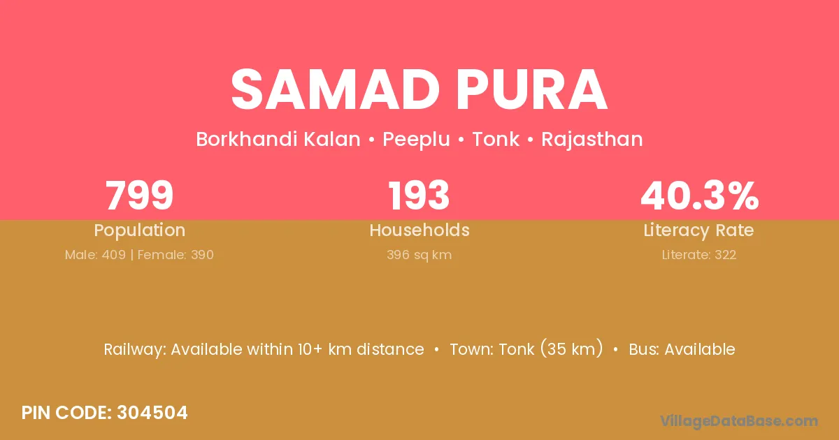 Tonk (35 km) is the nearest town to Samad Pura village for major economic activities and is located approximately 35 km away.