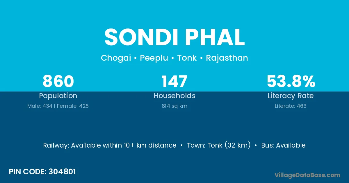 Tonk (32 km) is the nearest town to Sondi Phal village for major economic activities and is located approximately 32 km away.
