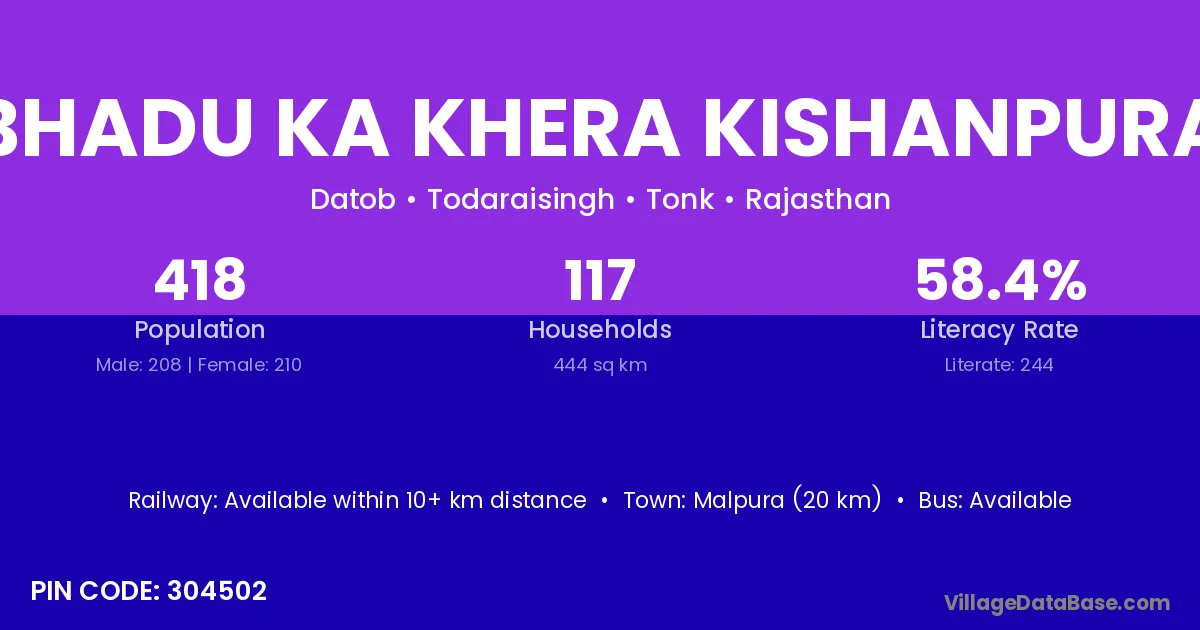 Malpura (20 km) is the nearest town to Bhadu Ka Khera Kishanpura village for major economic activities and is located approximately 20 km away.