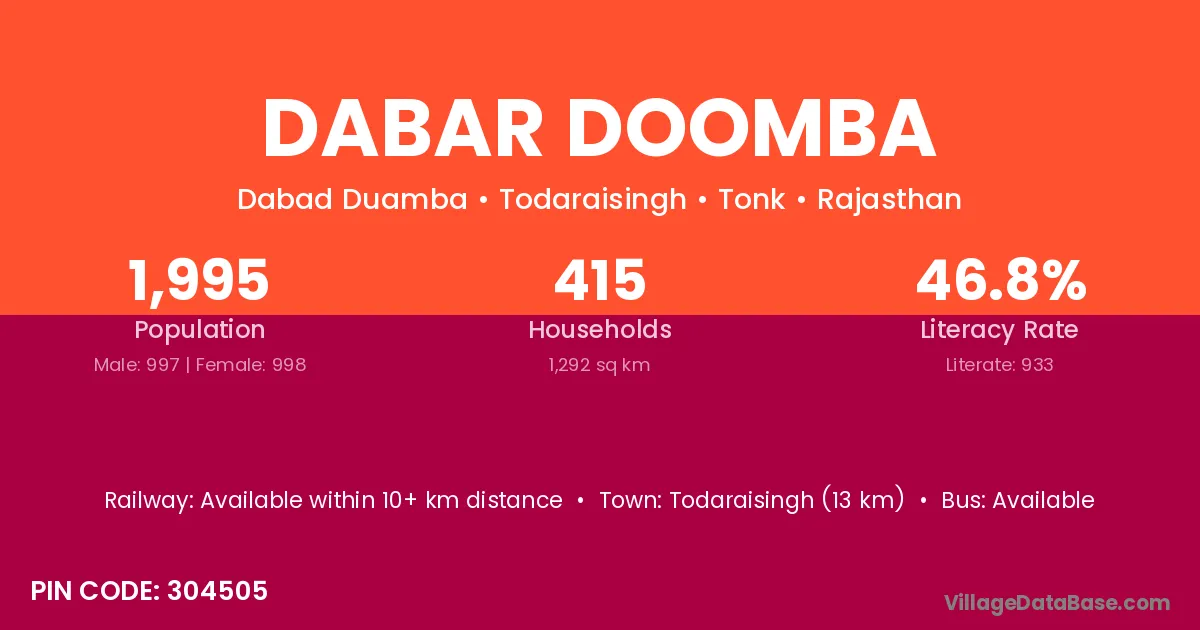 Todaraisingh (13 km) is the nearest town to Dabar Doomba village for major economic activities and is located approximately 13 km away.