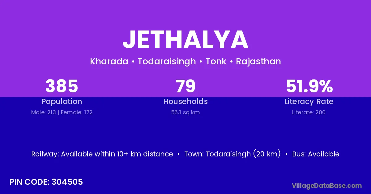 Todaraisingh (20 km) is the nearest town to Jethalya village for major economic activities and is located approximately 20 km away.