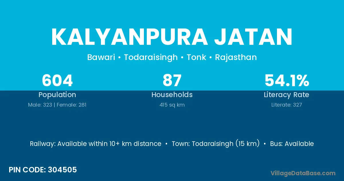 Todaraisingh (15 km) is the nearest town to Kalyanpura Jatan village for major economic activities and is located approximately 15 km away.