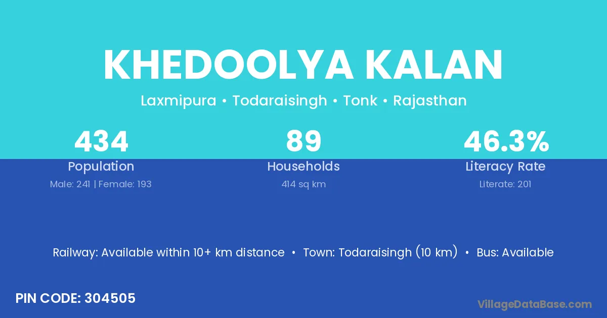 Khedoolya Kalan village has a total population of 434 people, of which 241 are males and 193 are females.