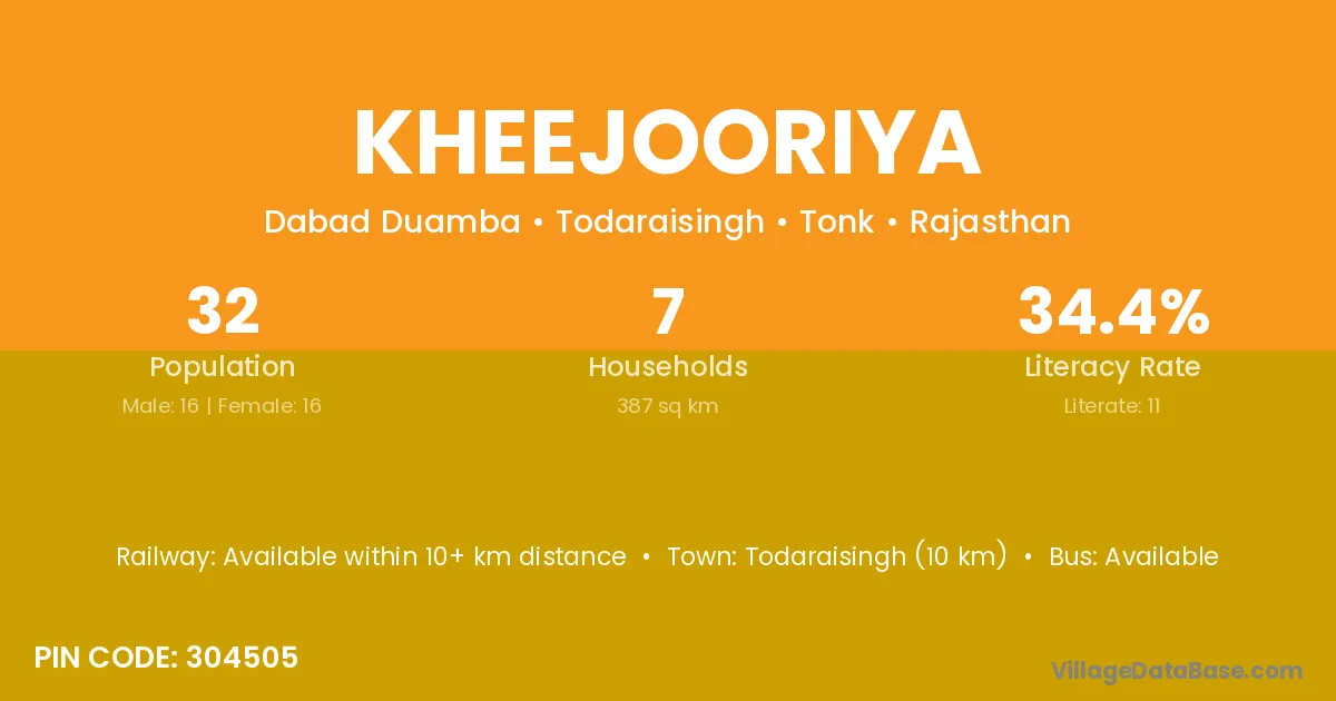 Kheejooriya village has a total population of 32 people, of which 16 are males and 16 are females.