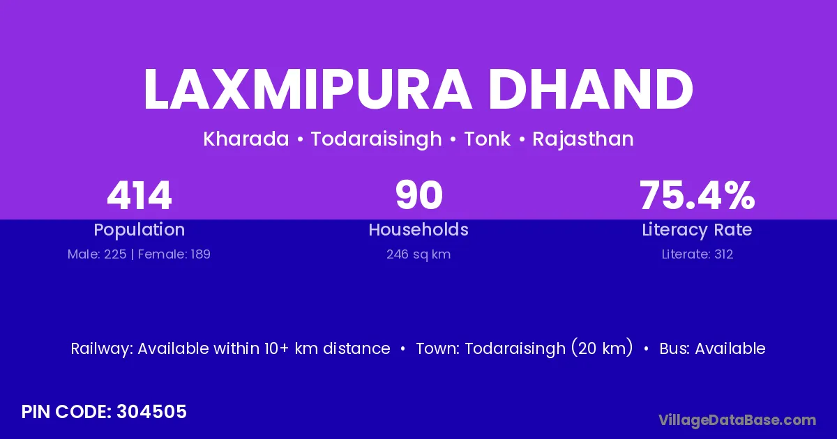 Laxmipura Dhand village has a total population of 414 people, of which 225 are males and 189 are females.