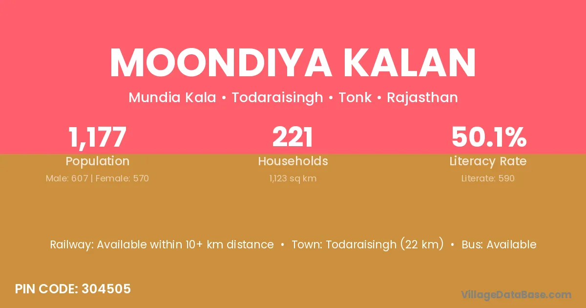 Moondiya Kalan village has a total population of 1,177 people, of which 607 are males and 570 are females.