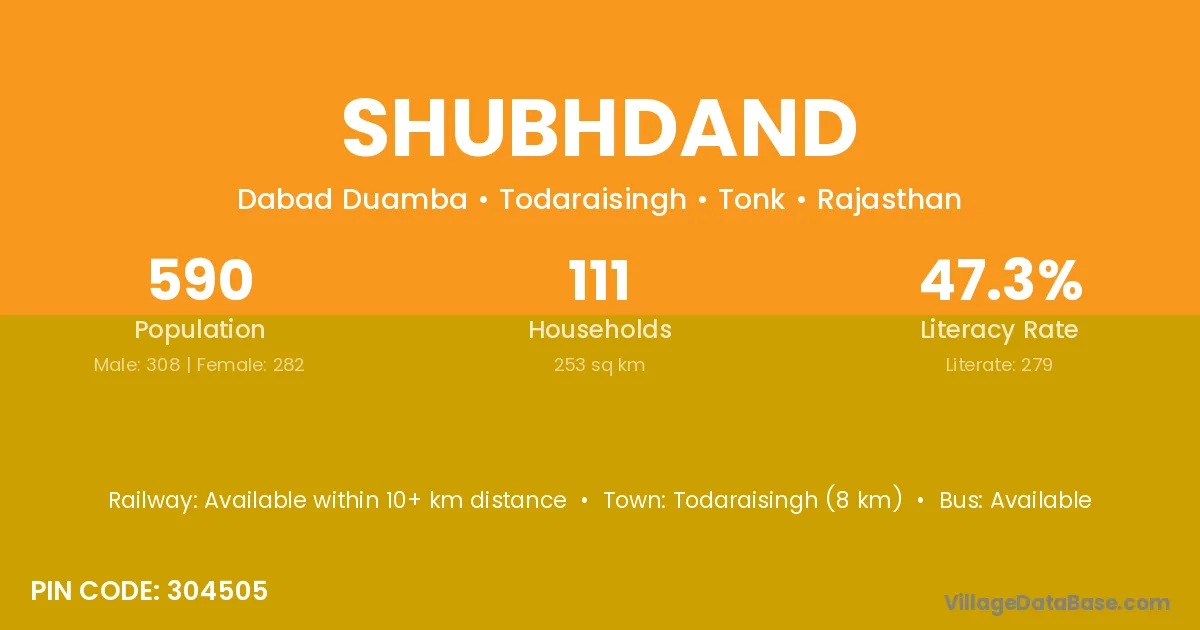 Todaraisingh (8 km) is the nearest town to Shubhdand village for major economic activities and is located approximately 8 km away.